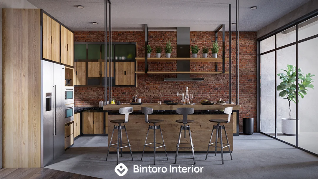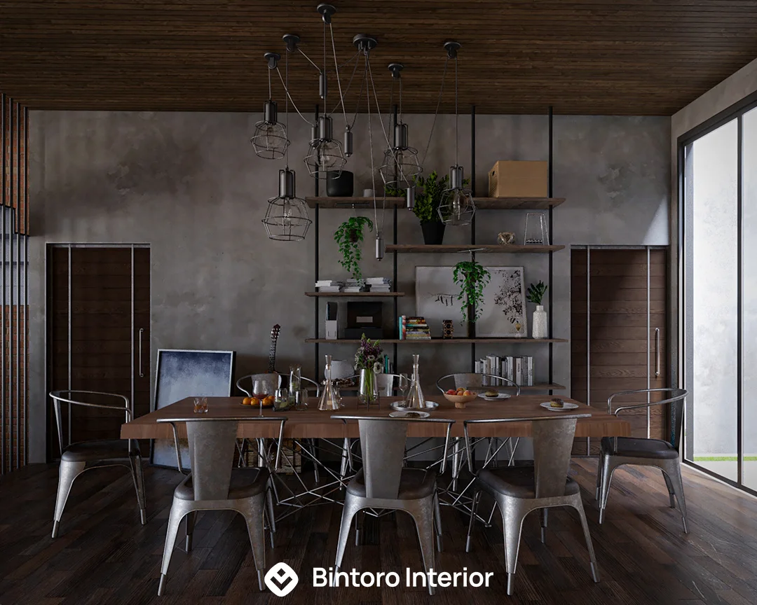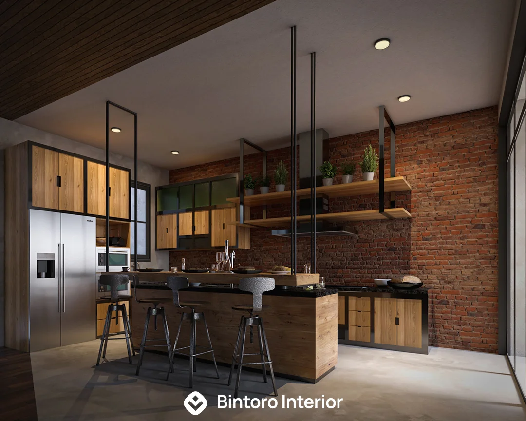 Area ini mengusung gaya Industrial yang otentik, ditandai dengan dinding bata ekspos, concrete ekspos, dan rangka metal gelap. Desain ini secara unik memadukan kitchen set fungsional dengan meja makan kayu mentah dan lampu gantung ekspos. Perpaduan material kasar ini diimbangi furnitur kulit vintage, menciptakan suasana yang stylish, berkarakter, dan hangat. Percayakan perancangan kitchen dan dining area Industrial Anda kepada tim profesional kami, dan ruangan impian Anda akan terwujud dengan desain premium serta kualitas terjamin.