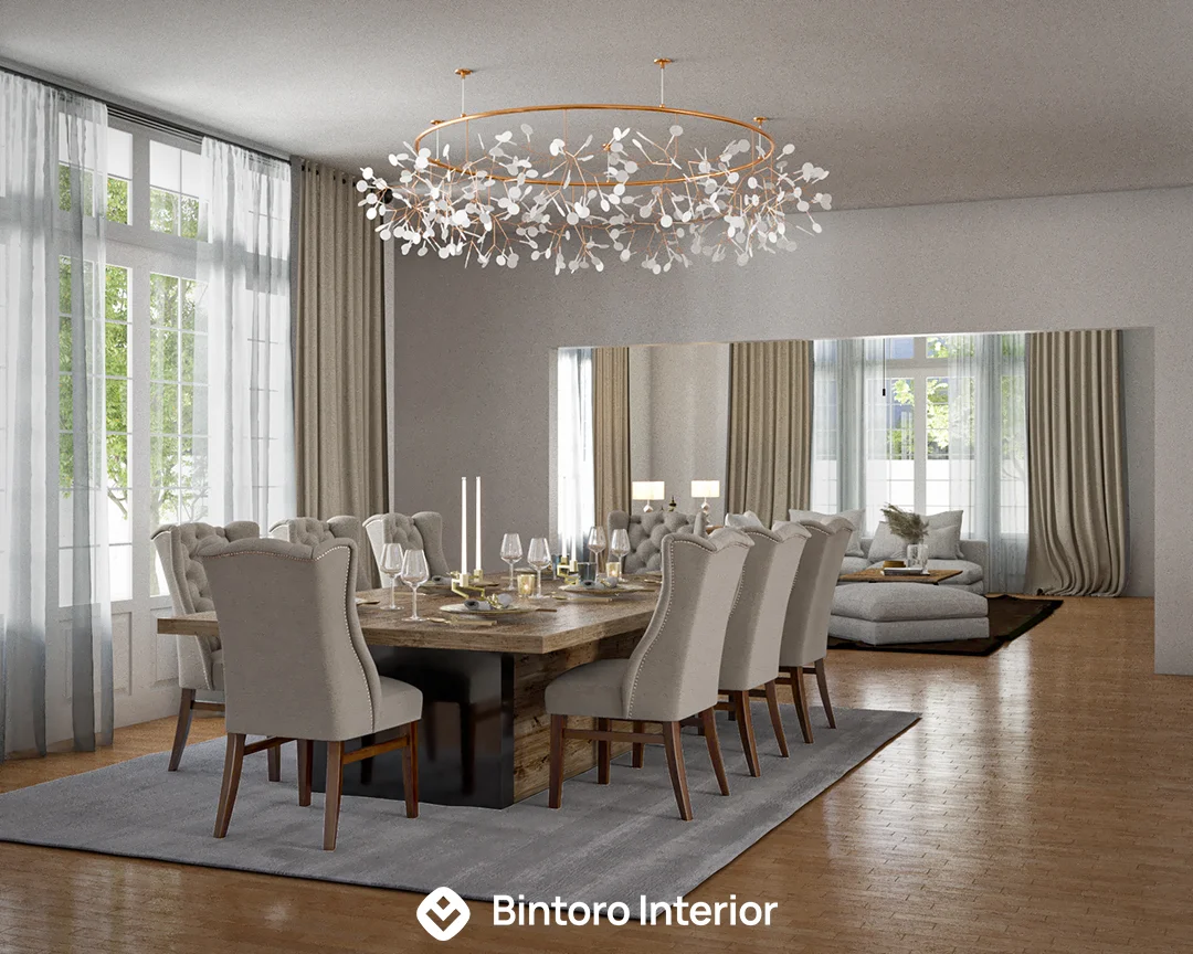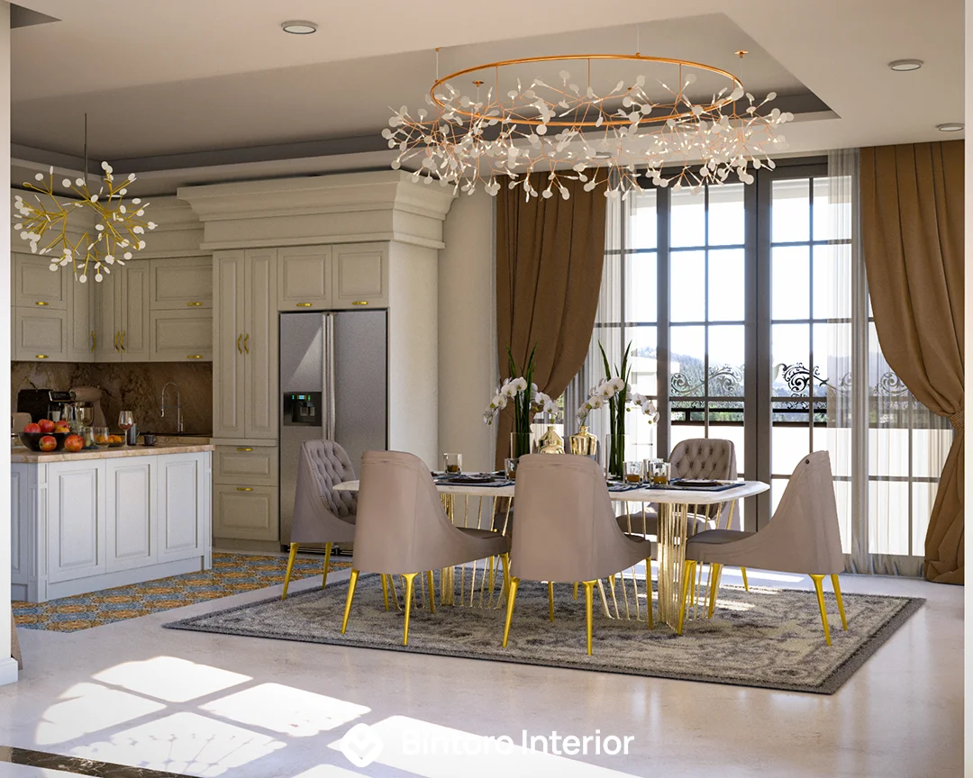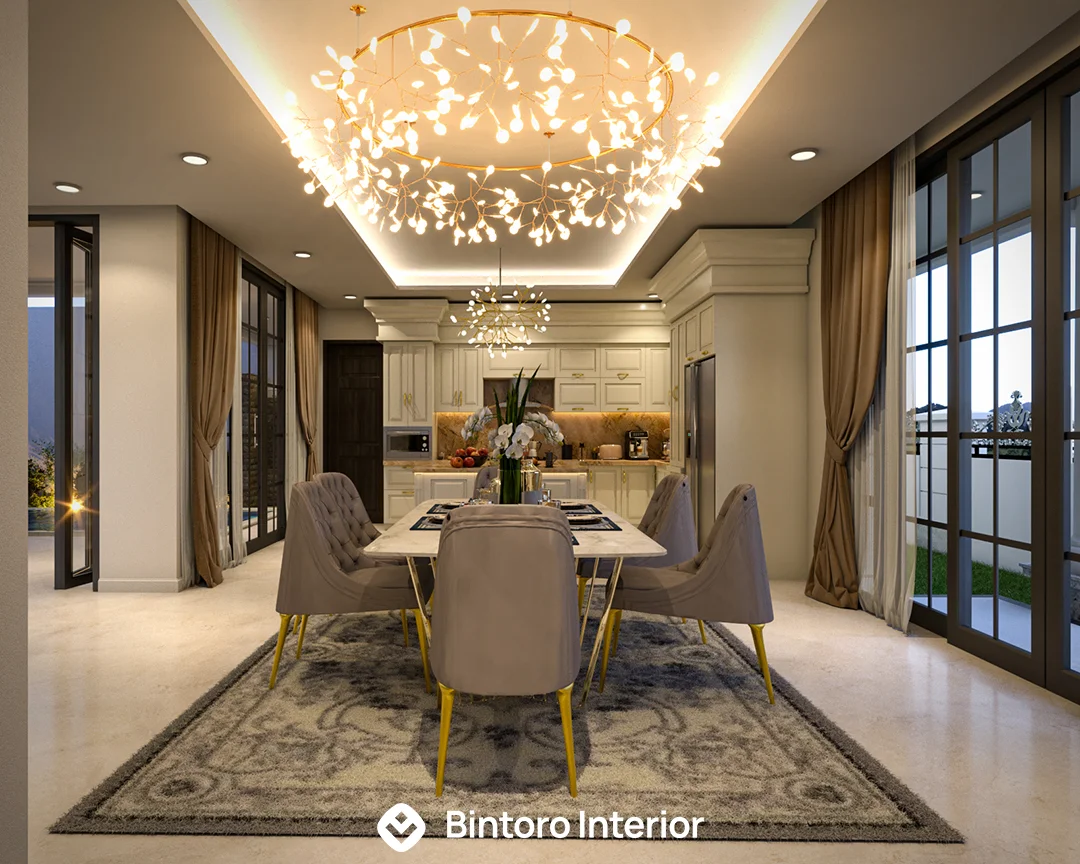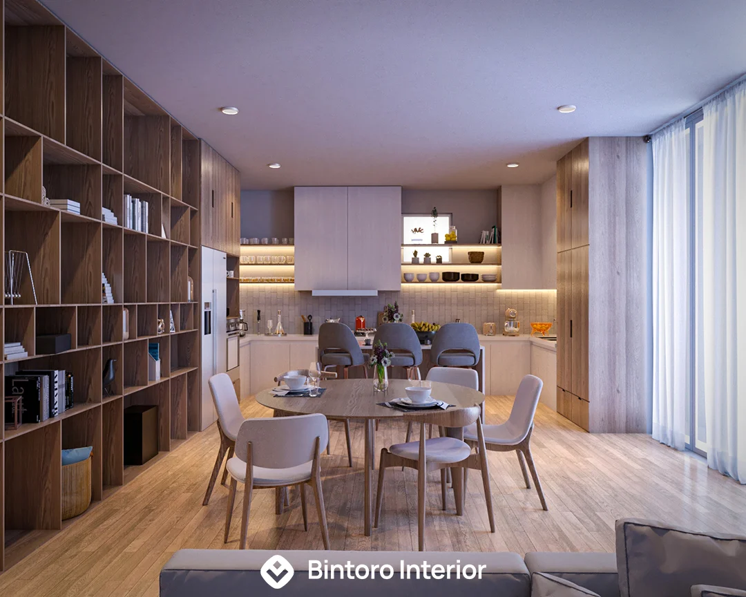 Bintoro Interior menawarkan beragam pilihan desain ruang makan yang elegan, mulai dari gaya American Style dan European Style yang fokus pada meja besar, kursi mewah, dan chandelier berkelas untuk suasana formal. Bagi penggemar gaya modern yang hangat, kami menghadirkan konsep Japandi dengan meja kayu natural dan kursi minimalis, atau Contemporary Style yang berfokus pada wall panel artistik dan pencahayaan dramatis. Kami juga siap mewujudkan desain Futuristik yang unik melalui furnitur geometris dan teknologi terintegrasi. Percayakan perancangan ruang makan Anda kepada tim profesional kami, dan ruangan impian Anda akan terwujud dengan desain premium serta kualitas terjamin.