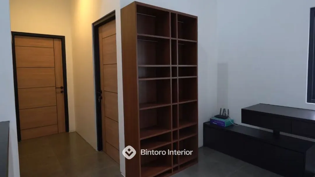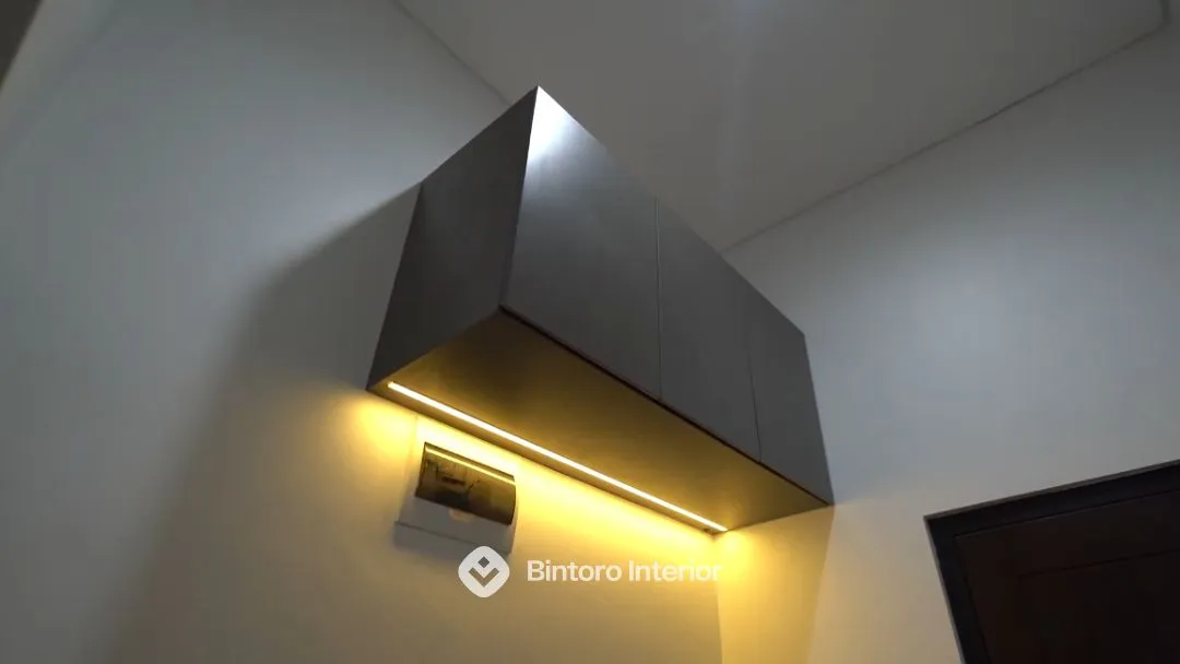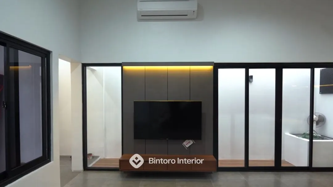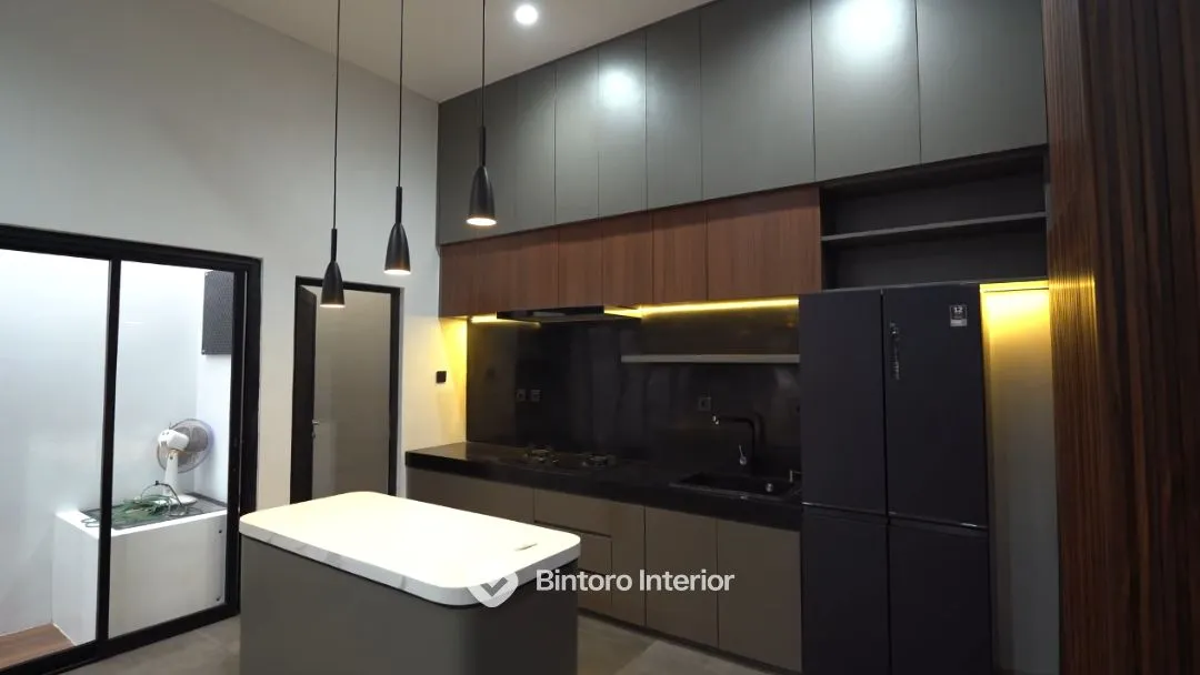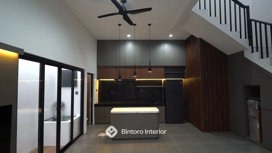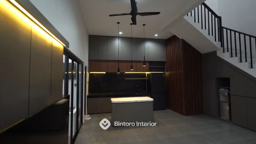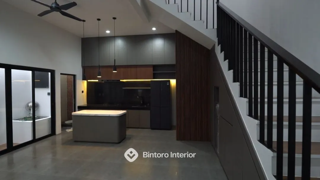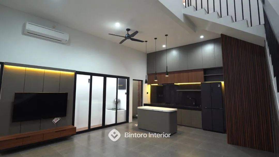 Bintoro Interior merancang hunian Mr. Bubun dengan konsep Open-Concept Modern yang terintegrasi, memaksimalkan fungsionalitas ruang terbatas. Area living dan kitchen disatukan secara sleek dengan dominasi built-in kabinet abu-abu dan cokelat kayu, dipertegas slat kayu vertikal sebagai elemen dekoratif. Penggunaan pencahayaan tersembunyi (cove lighting) pada panel TV dan kitchen set menciptakan suasana modern yang hangat dan elegan. Wujudkan interior hunian berkarakter Anda bersama tim profesional Bintoro Interior, di mana kualitas premium dan rancangan cerdas adalah komitmen utama kami.