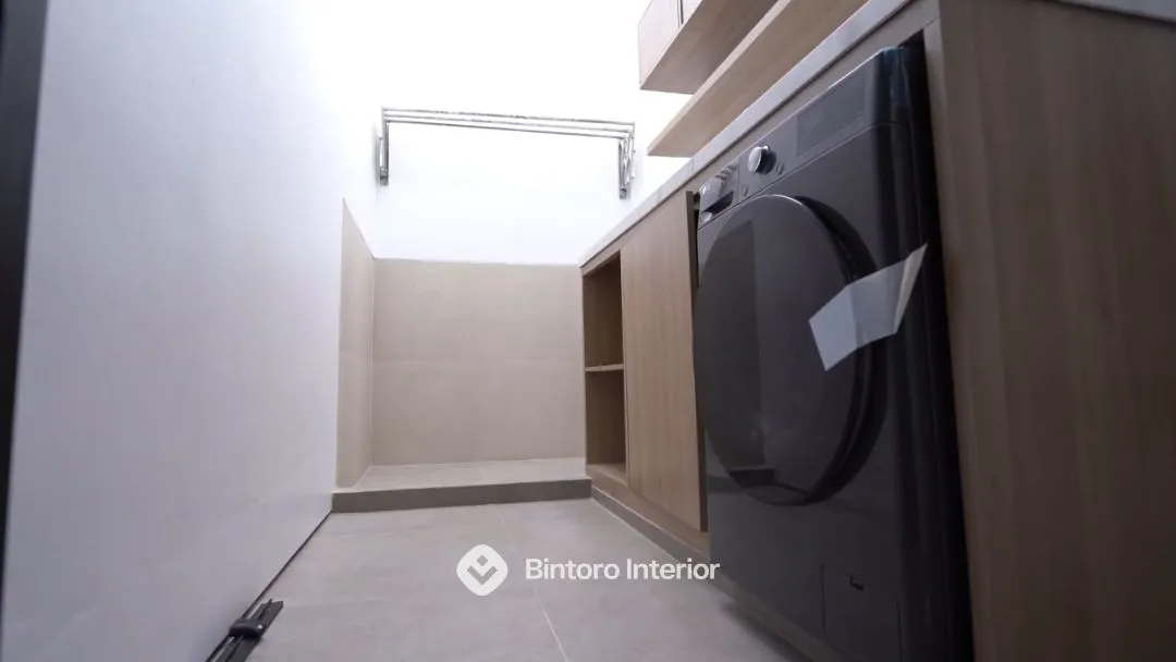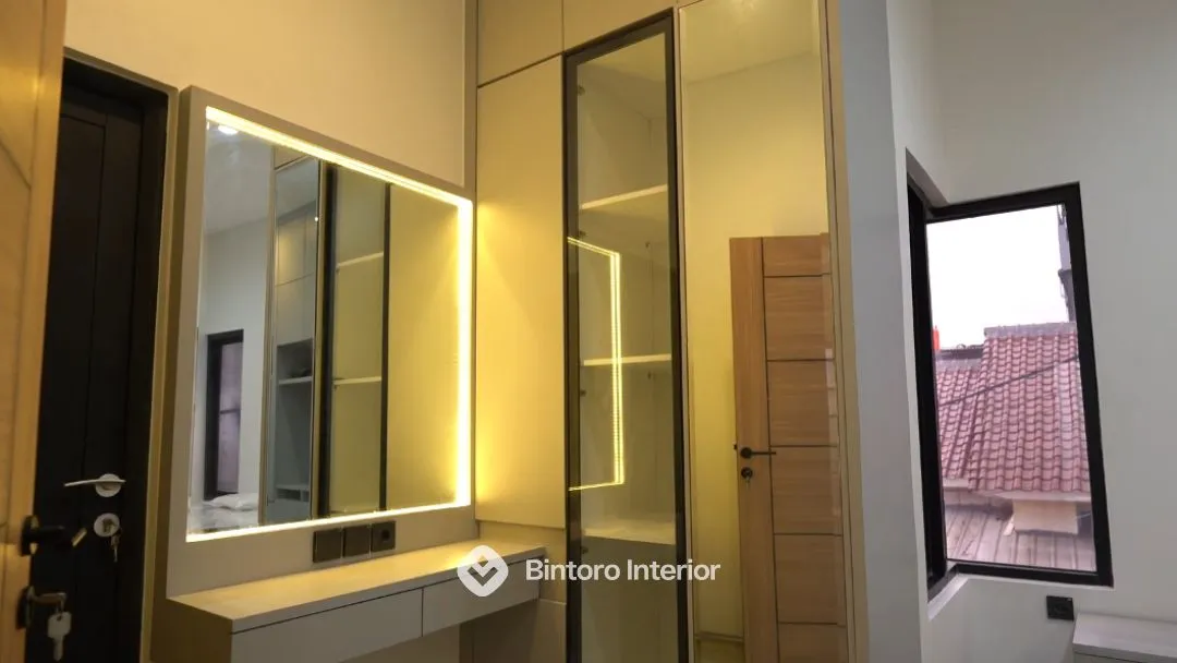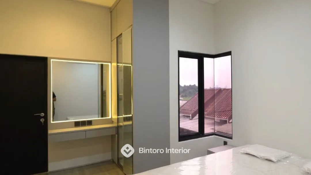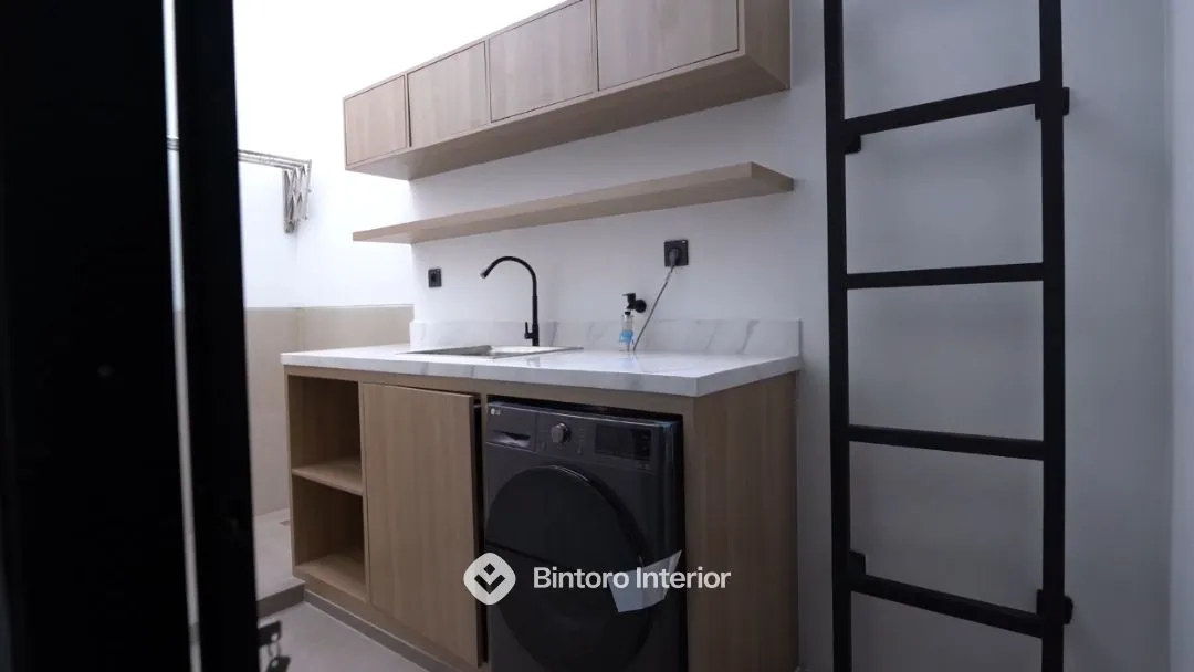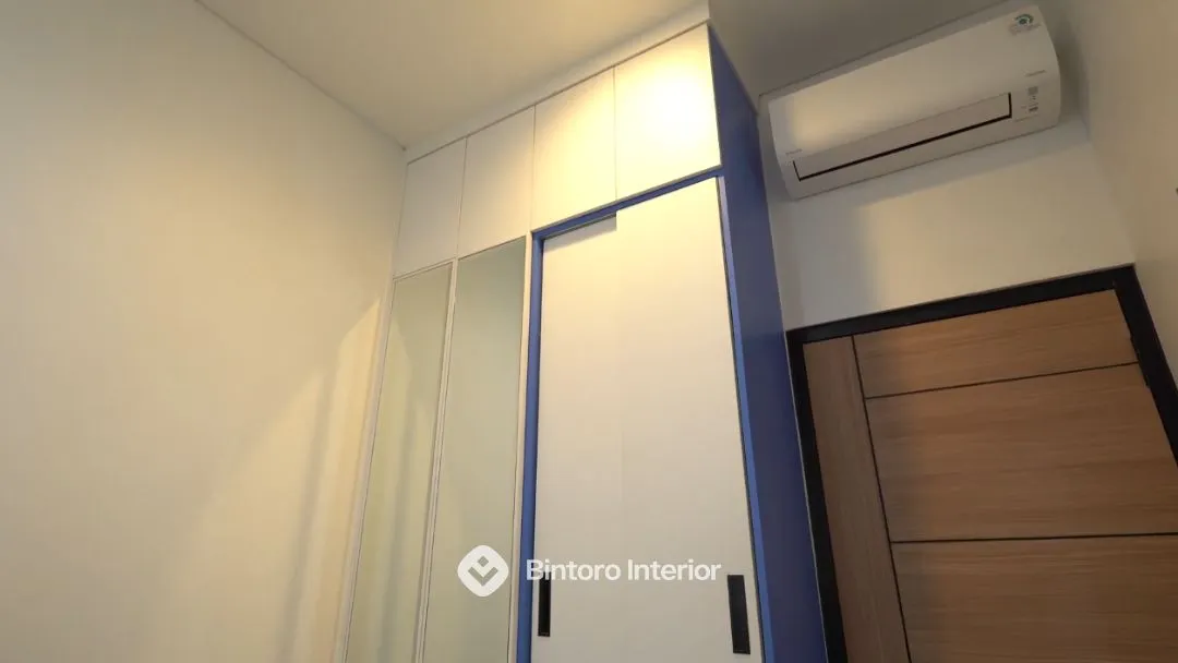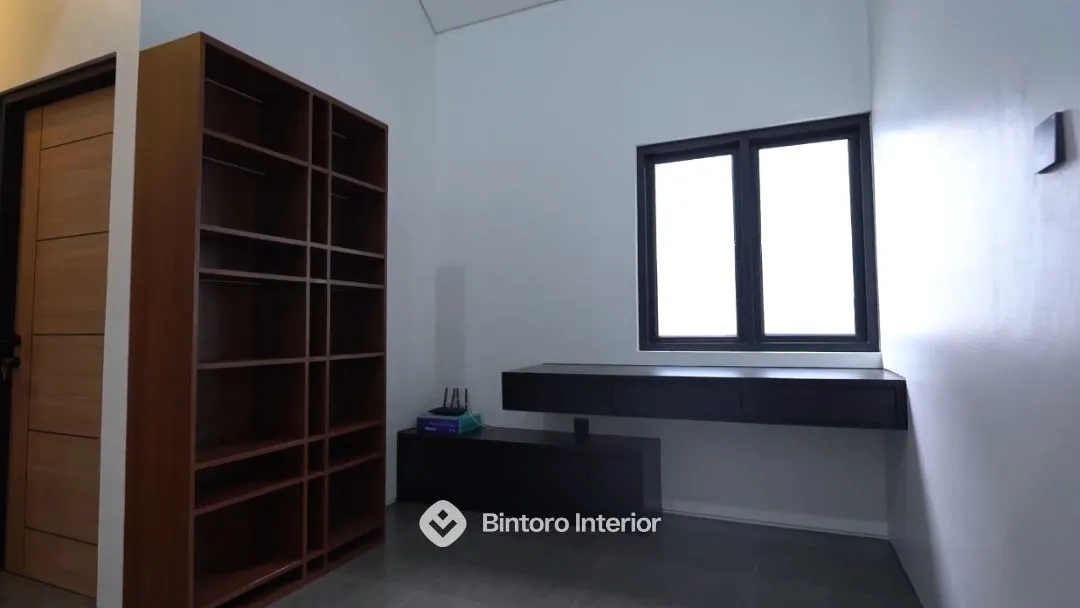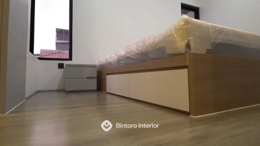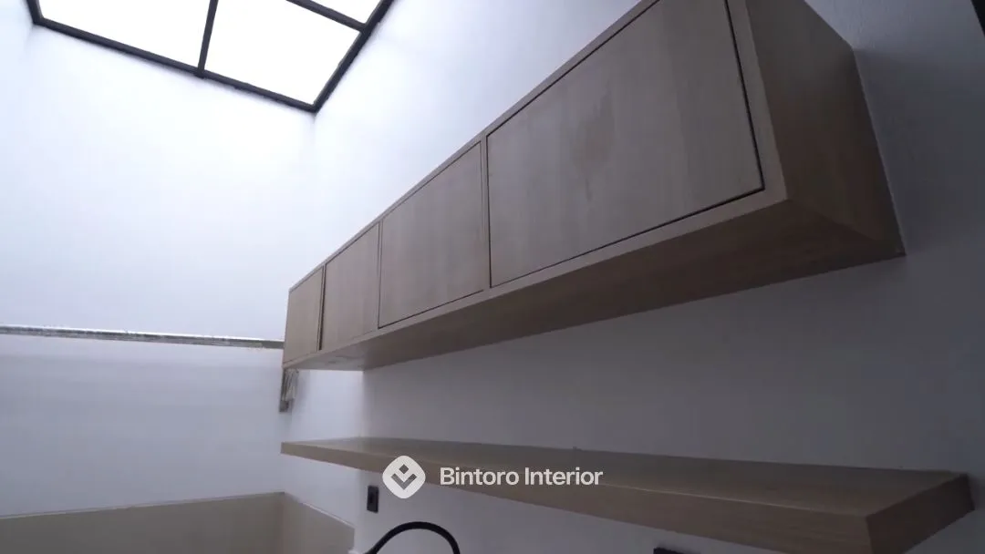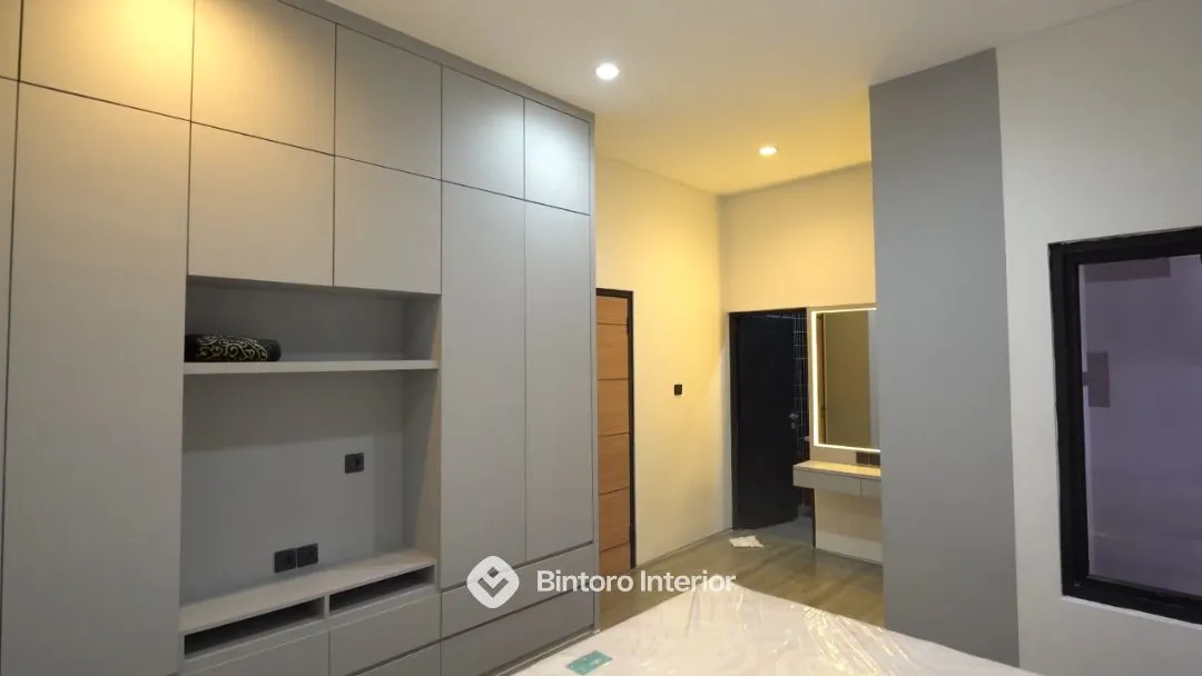 Bintoro Interior merancang hunian Mr. Bubun dengan konsep Open-Concept Modern yang terintegrasi, memaksimalkan fungsionalitas ruang terbatas. Area living dan kitchen disatukan secara sleek dengan dominasi built-in kabinet abu-abu dan cokelat kayu, dipertegas slat kayu vertikal sebagai elemen dekoratif. Penggunaan pencahayaan tersembunyi (cove lighting) pada panel TV dan kitchen set menciptakan suasana modern yang hangat dan elegan. Wujudkan interior hunian berkarakter Anda bersama tim profesional Bintoro Interior, di mana kualitas premium dan rancangan cerdas adalah komitmen utama kami.