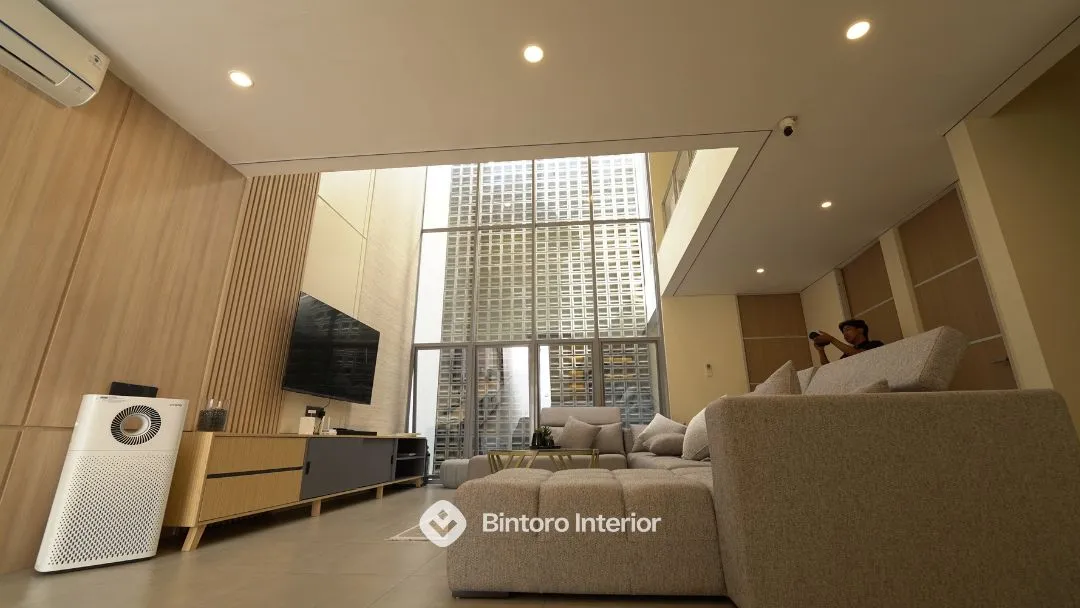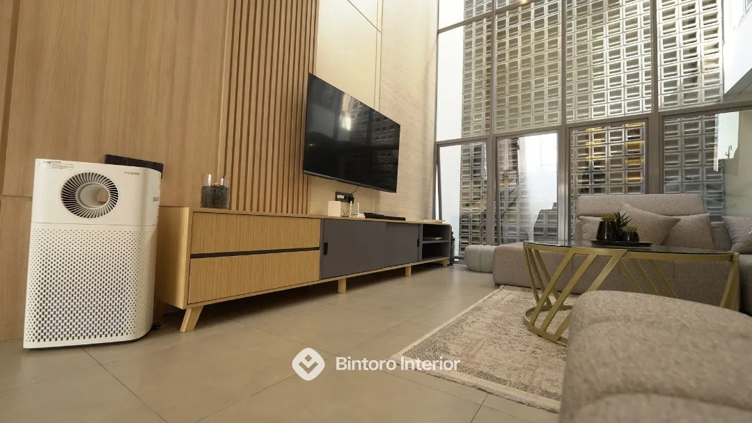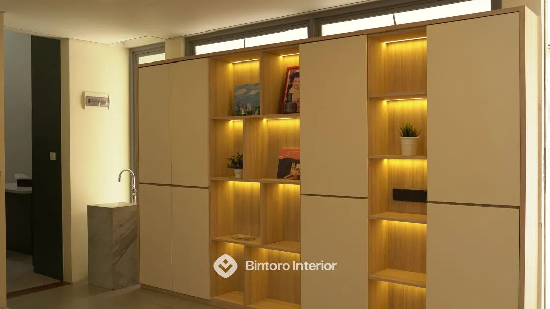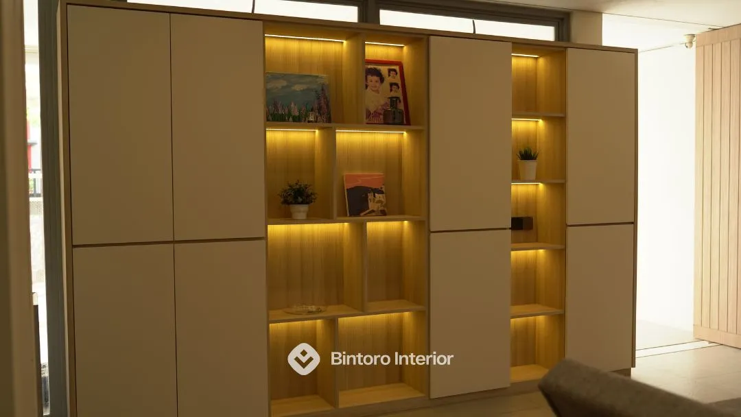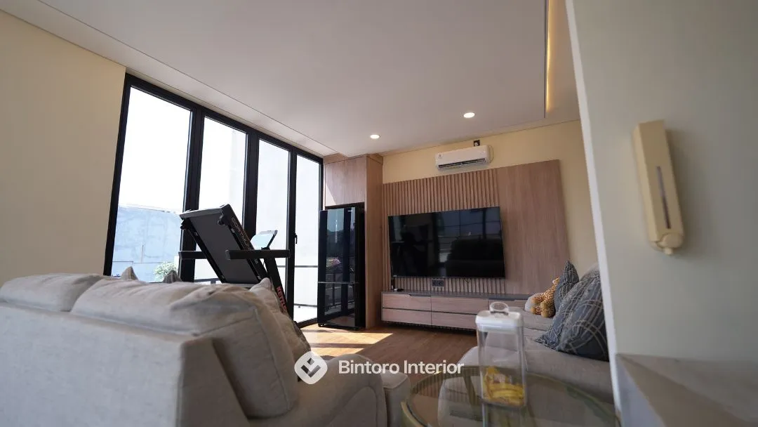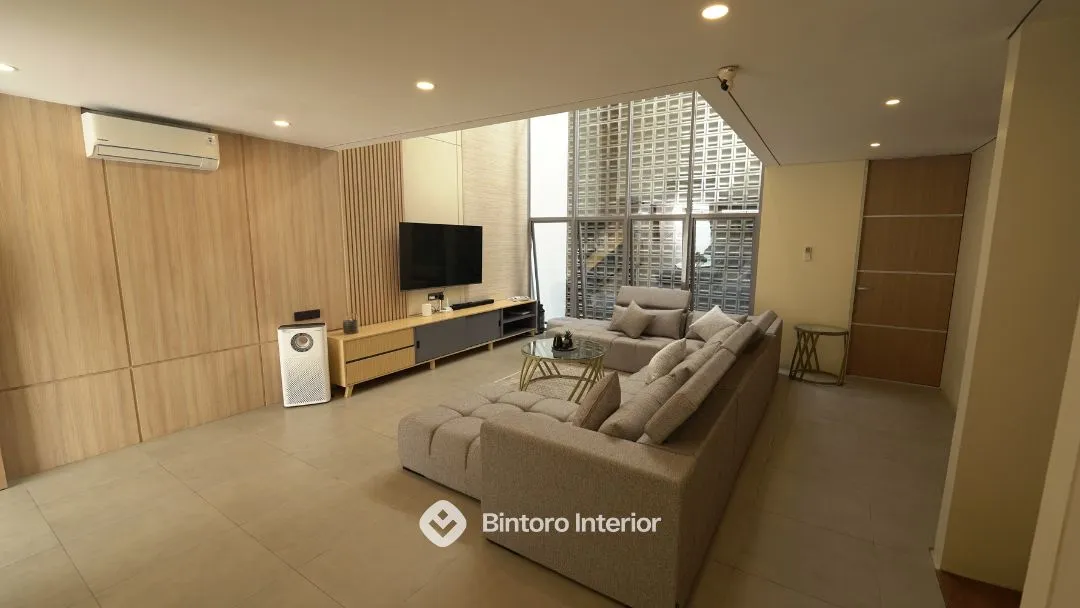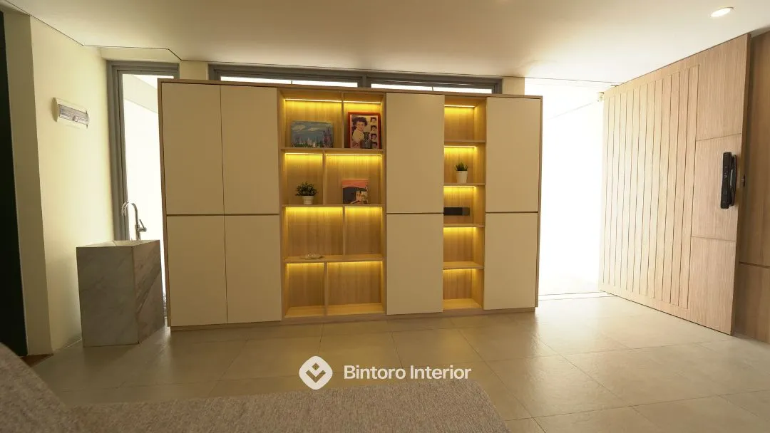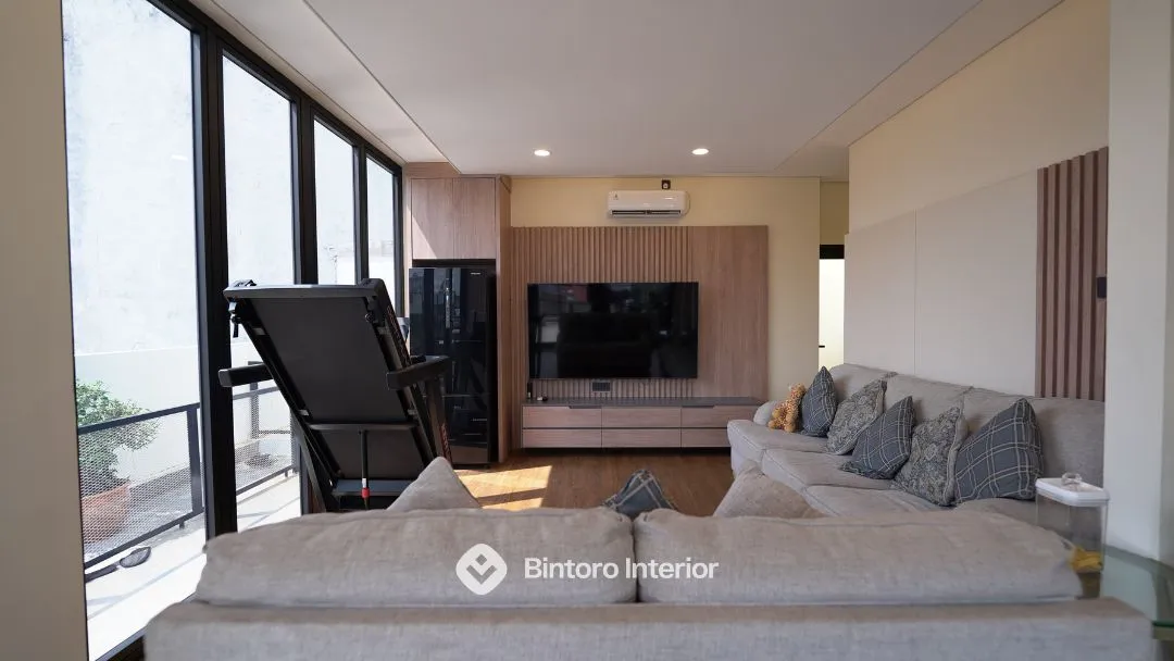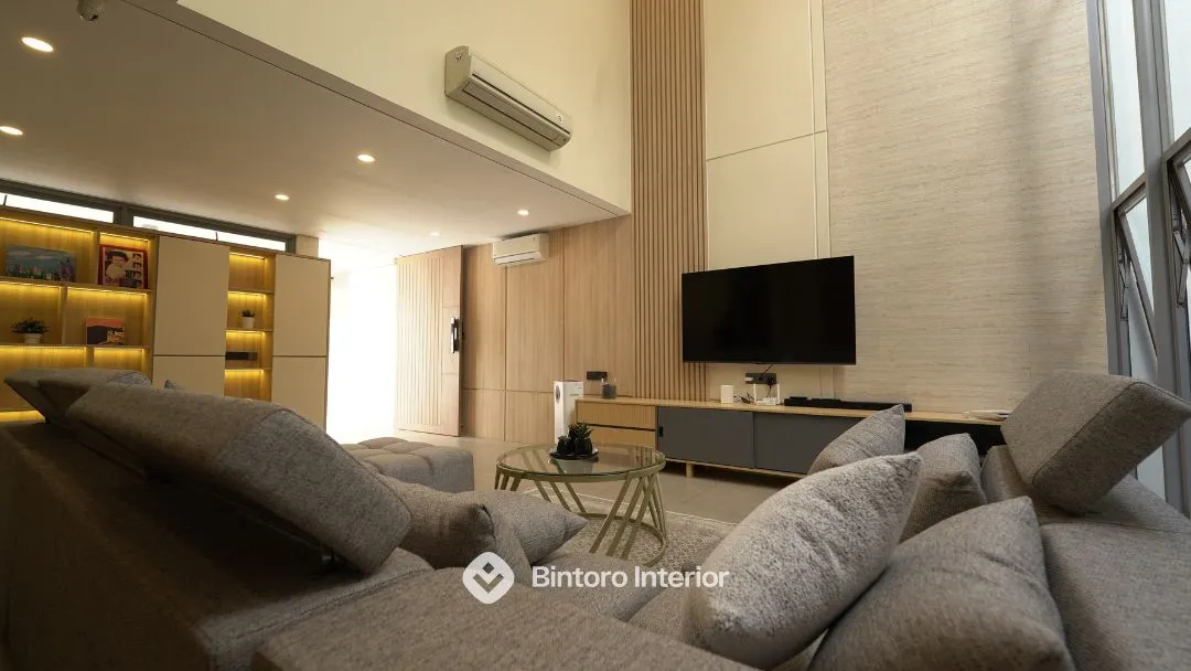 Bintoro Interior menciptakan hunian Mr. Fuadi dengan desain Kontemporer Hangat, di mana keterbukaan ruang berpadu harmonis dengan slat kayu bernuansa cerah. Area ruang keluarga disegarkan dengan jendela tinggi dan dinding aksen kayu, built-in TV minimalis, serta sofa modular yang mengundang kehangatan. Kabinet dan lemari pakaian di seluruh rumah didesain tanpa handle dengan warna netral seperti abu-abu, menjamin estetika sleek yang rapi dan fungsional. Segera konsultasikan visi interior Anda, dan biarkan Bintoro Interior mewujudkan hunian impian dengan sentuhan premium dan jaminan kualitas terbaik.